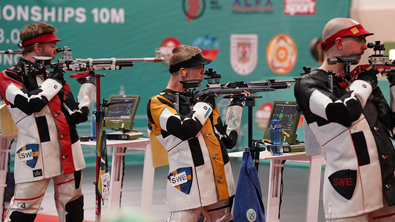 Det svenska herrjuniorlaget, ledda av världsmästaren Victor Lindgren, ordnade fram en bronsmatch i det nya trioformatet, där deltagarna skjuter 20 skott vardera i varje omgång. Först går de åtta bästa lagen vidare till kvartsfinal, och därifrån går fyra vidare till semifinal för att där tävla om vilka två lag som går till guldfinal och vilka som får skjuta om bronset.