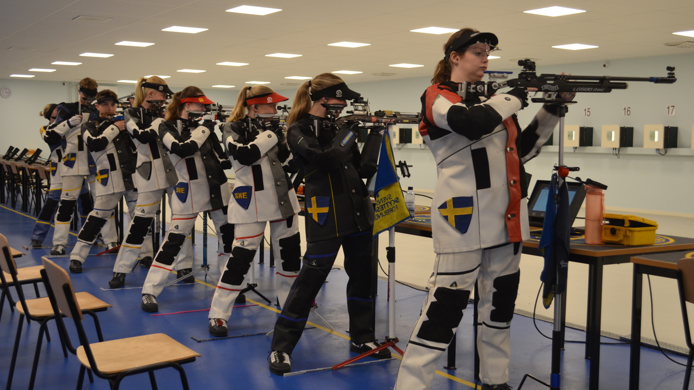 OS-skytten tillika RIG-instruktören Marcus Madsen visade eleverna hur det ska gå till då första EM-kvalet i form av Dubbelluften inleddes i Sörabyhallen i Rottne under lördagen.