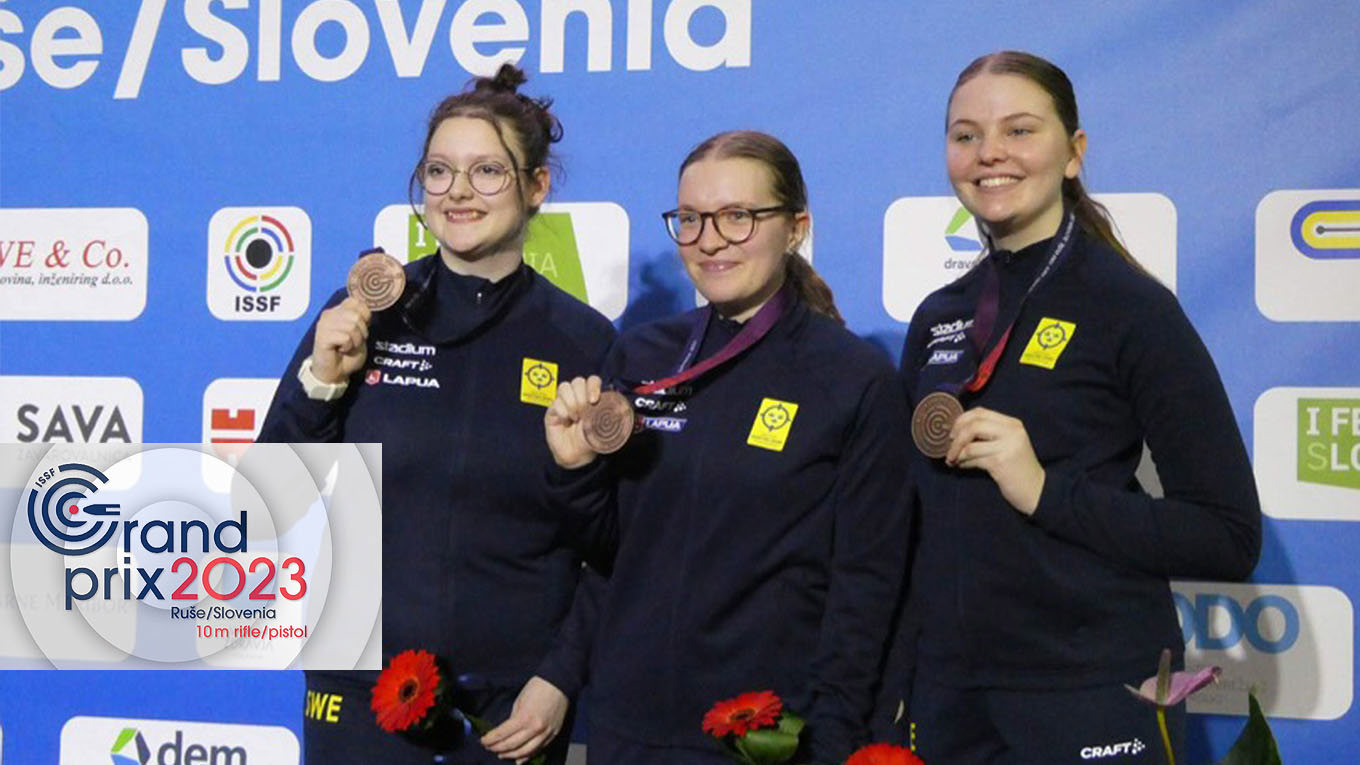 Gevärstjejerna Isabelle Johansson, Hannah Göransson och Amanda Karlsson säkrade ett svenskt brons i damernas lagtävling i GP-tävlingen i Ruse som avslutades under söndagen.