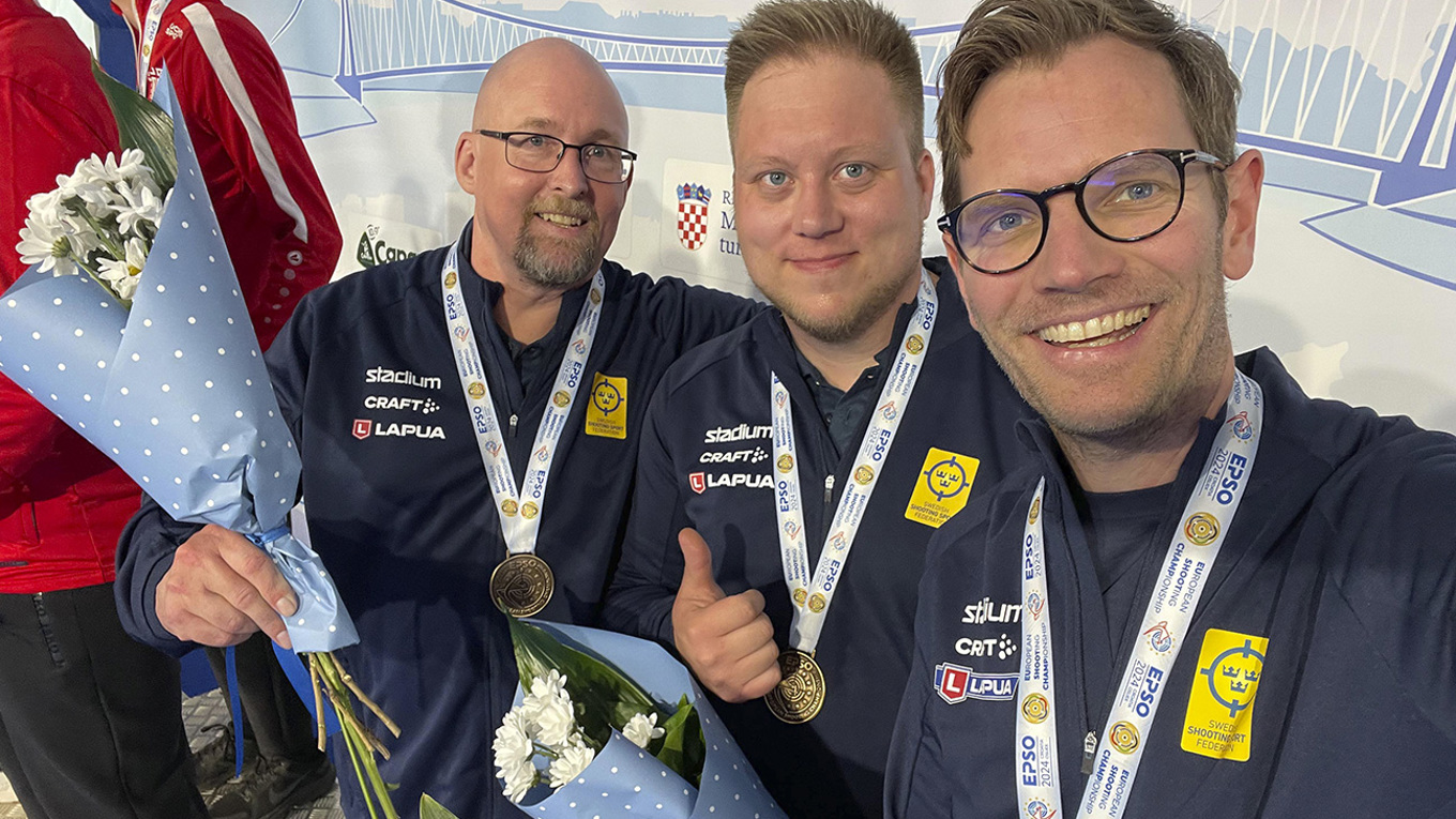 Krut-EM i Osijek fick inledas på bästa sätt; En svensk medalj är redan i hamn efter att gevärsherrarna skjutit hem lagbronset i 60 ligg på distansen 300m.