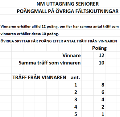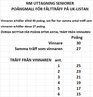 Poäng fördelas enbart till skytt som skjuter enligt nationella senior skjuttider i den aktuella uttagningstävlingen.