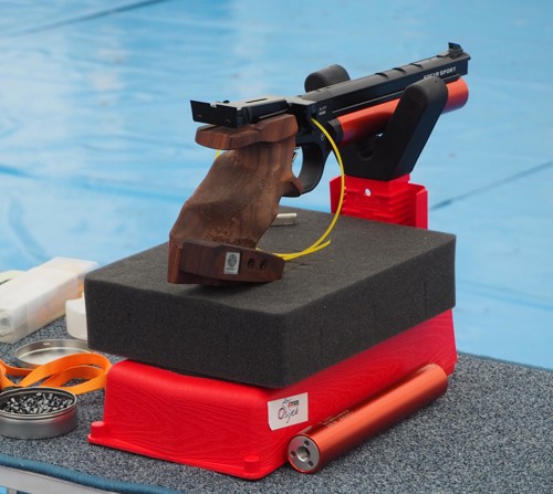 Exempel av laddningsblock för säker hantering av luftpistol för skyttar som bara har en hand.